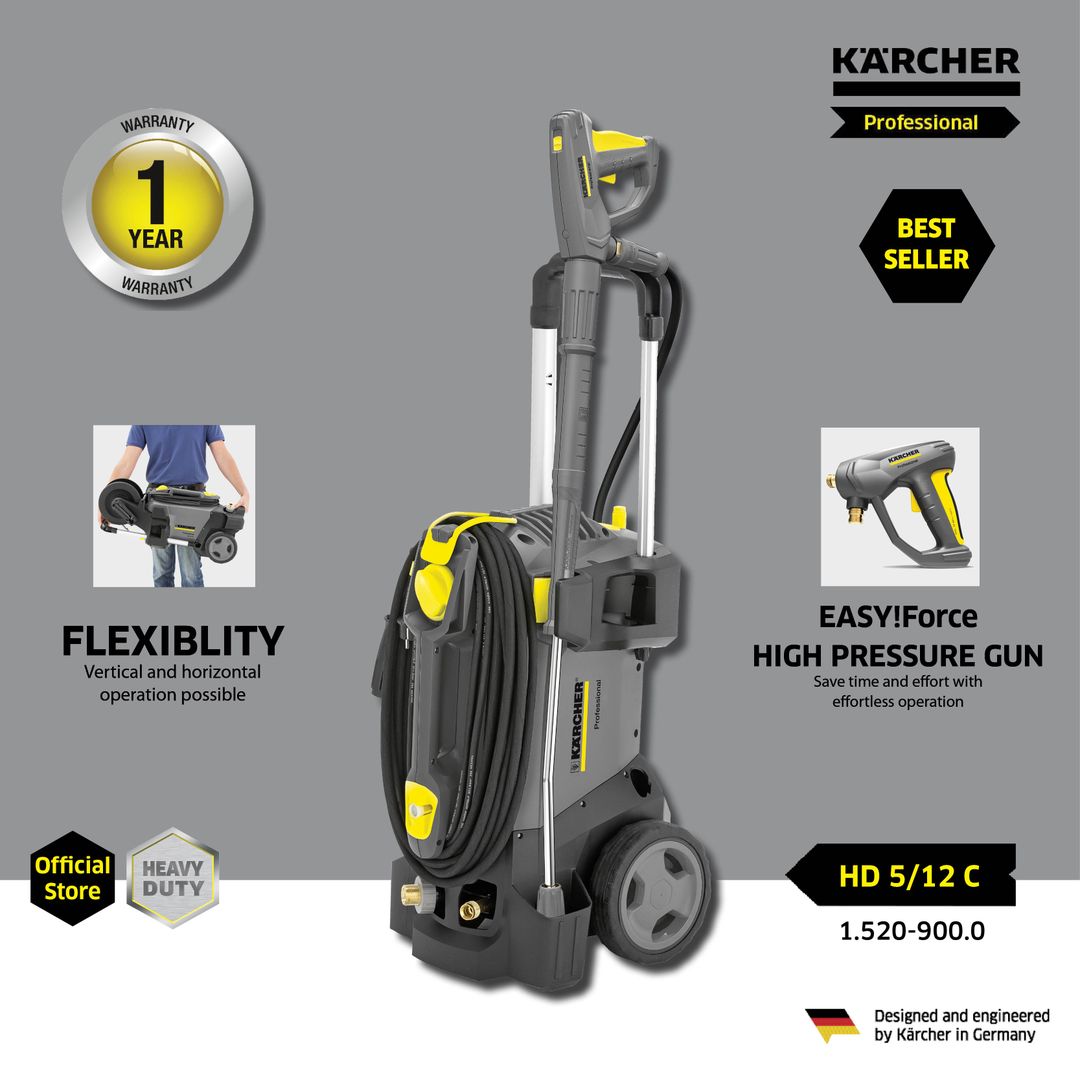 Pembersih bertekanan tinggi air dingin bertekanan tinggi HD 5/12 C yang ringkas, ringan, dan serbaguna menawarkan mobilitas yang luar biasa dan cocok untuk operasi vertikal dan horizontal. Mesin ini dilengkapi dengan penyimpanan aksesori yang canggih, dan kepala silinder kuningan serta pelepas tekanan otomatis memastikan masa pakai yang lama. Juga termasuk dalam paket peralatan adalah gun bertekanan tinggi EASY! Force yang baru dikembangkan dan fastener fast-release EASY! Lock. Sementara gun bertekanan tinggi EASY! Force memanfaatkan kekuatan mundur dari jet bertekanan tinggi untuk mengurangi gaya menahan ke nol, pengencang EASY! Lock quick-release membuat penanganan lima kali lebih cepat daripada dengan koneksi sekrup konvensional, tanpa kehilangan segala ketahanan atau umur panjang. Pengoperasian yang mudah serta penyetelan dan pembongkaran yang hemat waktu karena itu ditampilkan sebagai standar dan mewakili konsep keseluruhan alat berat yang berhasil.