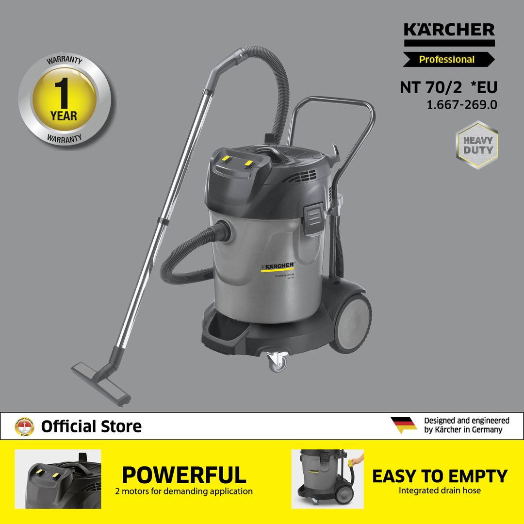 Mesin seri NT 70 terdiri dari penyedot debu basah dan kering yang besar dan bertenaga dengan hingga tiga motor. Portofolio model lengkap, yang menunjukkan keunggulannya terutama dalam aplikasi basah dan saat menyedot kotoran kasar. Daya hisap yang kuat dan kualitas Karcher yang teruji dengan harga terjangkau.